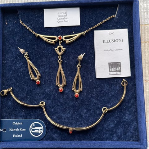 Käytössä ollut pronssinen Kalevalan Illusioni -kaulakoru Karneoli -kivellä. Ketjun pituus n. 40/43 cm. Rasiaa ei ole. Pakettiautomaattilähetys Manner-Suomeen 6 euroa, josta saa lähetyksen seurantanumeron. Nouto Kuopiosta keskustasta.