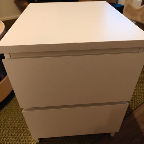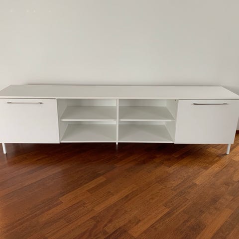 Siisti IKEA valkoinen TV-taso. Pöydässä avoin hyllytila säilytykseen.