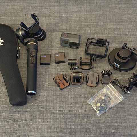 GoPro Hero5 -kamera, johon kuuluu useita lisätarvikkeita, kuten kotelot, kiinnikkeet ja kaapelit. Mukana laturi, 2kpl akku ja erilaisia kahvoja.GoPro Hero5 edustaa modernia toimintakameratyyliä, joka on suunniteltu kestämään vaativia olosuhteita ja tarjoamaan korkealaatuista videokuvaa.
