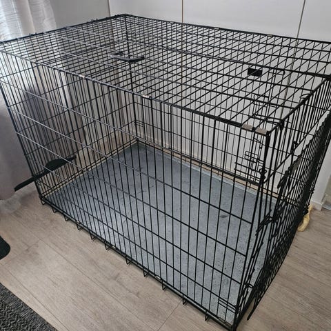 Leveys 96 cm, Syvyys 87 cm ja korkeus 68 cm, toisen oven kaltereissa koiran puremajälkiä.