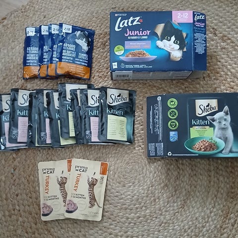 Reilu satsi kissanruokia sekä piimaa hiekkaa. Whiskas 44 pussia eri makuja. Latzs kuivamuona 2 kg. Mousse 3 purkkia. Sheba 6x50. Piimaa kissanhiekka noin 5 kg.