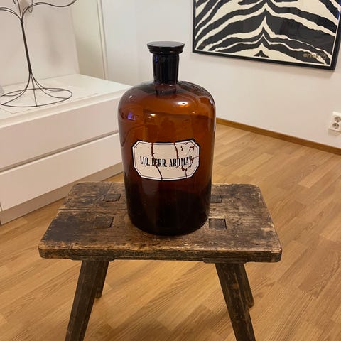 Ehjä ja siistikuntoinen lintukorkkinen ruskea apteekkipullo. Pohjassa teksti 75 k. Korkeus 13 cm.