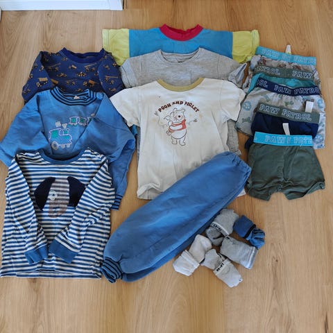 Setti jossa 2 bodyä, 2 fleecetakkia, softshell takki ja housut suunnilleen samaa kokoa. Paljon käytetyt, mutta edelleen ehjät. Ajoittain jotain tahroja joita en ole yrittänyt poistaa.