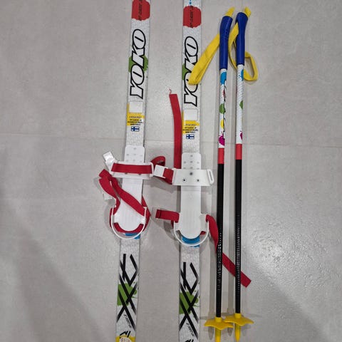Lasten sukset 90 cm ja sauvat 70cm, käytetty yhden talven ajan. Esim. 3-4 vuotiaalle. Oman 5 vuotiaan talvikengät eivät enää mahdu näihin.