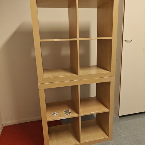 Annetaan muuton alta siistissä kunnossa oleva Kallax-hyllykkö, ostettu 2019. Yhdessä sivussa kolhu. Purettu osiin, nostettu äsken pihalle katoksen alle odottamaan hakijaa.
