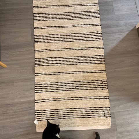 Väriltään vaalea beige. Pesun jäljiltä. Koko n. 79,5 x 149 cm. Lateksipohja, joka on muutamasta kohdasta kuivahtanut ja niistä kohdista irtoaa hienoista putua.