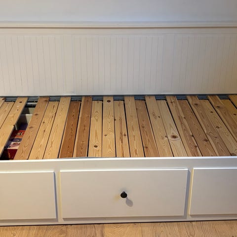 Tilavat säilytyslaatikot. Kaikki mekanismit toimivat, sälepohjasta puuttuu yksi säle. Siistikuntoinen, muutama elämänjälki löytyy.