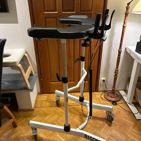 Avustin kuntoutukseen operaation tai vastaavan jälkeen. Lisävarusteltu jarruilla. Uuden veroinen. Vastaavan tuotteen hinta uutena ilman jarruja yli 700 euroa.