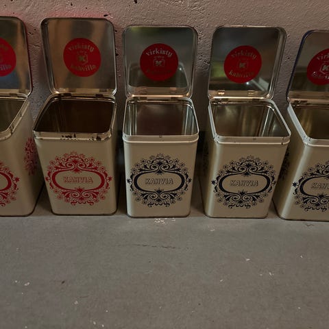 Ulkoa nätit purkit, sisällä käytönjälkiä. Nyt vanhemmillani koristeena olleet niin kauan kun muistan.