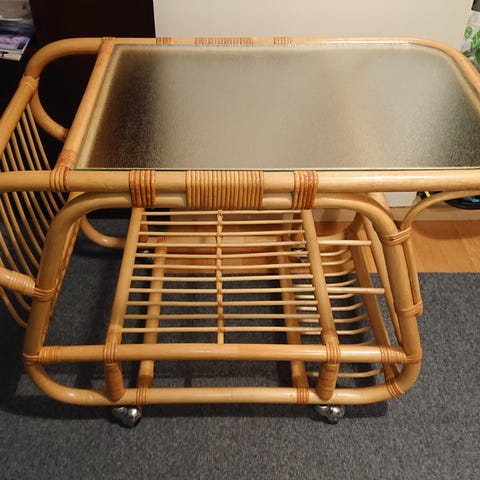 Tämä upea vintage tarjoilukärry etsii uutta kotia. Kunto hyvä. Renkaat toimivat hyvin. Kaksi lasitasoa sekä yksi vaneritaso.