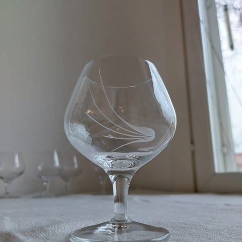 1. Jalalliset lasit / konjakkilasit, 6 kpl, siistit, kirkas lasi, korkeus 11 cm, suun halkaisija 6,7 cm, jalan halkaisija 7,5 cm. Hinta yht. 8 e.