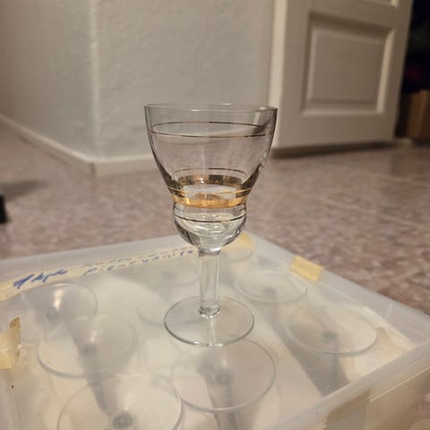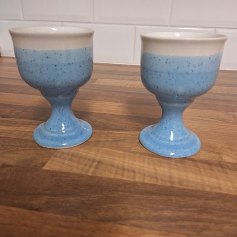 Kultakeramiikan kuusi sinivalkoista viinilasia/jälkiruokapikaria. Korkeus 11cm, kupin halkaisija 8cm. Hyväkuntoiset.