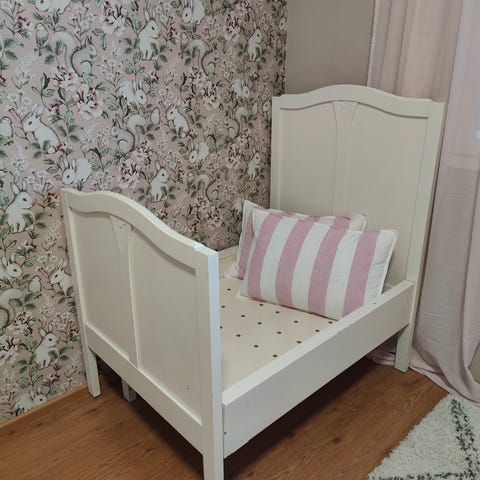 Sänky on jatkettava. Ollut käytössä patjan koossa 170X90cm. AVA roomin päiväpeitto teetetty tähän mittaan. Päiväpeitto kuuluu kauppaan, patja ei.