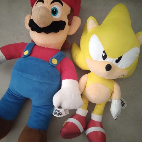 Kuvan mukaiset pehmolelut, Sonic, Supersonic, supermario ja yoshi.