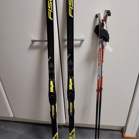 Fisherin sukset (120 cm)+ Snow Storm- monot (koko 30) + 4kaad sauvat (85 cm)