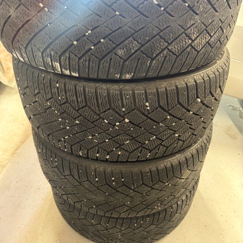 Continental VikingContact 6 kitkarenkaat. Yksi rengas paikattu kuten kuvassa näkyy.