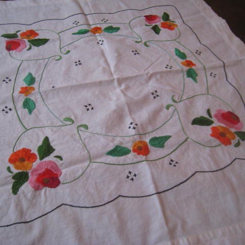 Käsityönä kirjottu ovaali pikkuliina, ikäisekseen siisti.