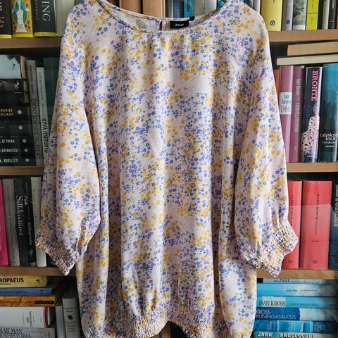 Uudenveroinen Zizzin pusero lehtikuvioista musta-beigeä polyesteriä. Koko L=50/52, kai-kai 69cm, helman leveys 80e, olka-helma 77cm. 3/4-hihat, joiden olkasamoissa on kaunis rypytys, napit hihansuissa. Edesdä kokonapitus. 12e mmm
