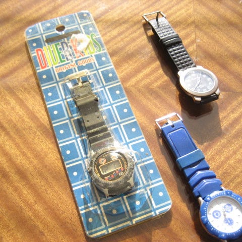 Perinteinen lasten rannekello, violetti kellotaulu ja valkoinen nahkahihna. Ostettu kultajousesta. Muuten täysin ehjä ja toimiva, mutta patterit pitää vaihtaa (onnistuu kotona).