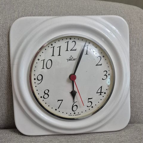 Toimiva keraaminen valkoinen seinäkello, mitat n.24 x 24 cm