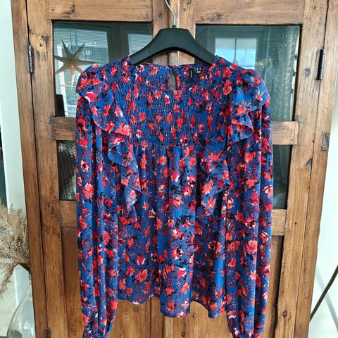 Kaunis kukkakuvioinen pusero. Yläosa edestä smokkirypytetty ja helma peplum-tyyppinen. Muutaman kerran käytetty. On oikein hyväkuntoinen. Mielestäni pieni M-koko.
