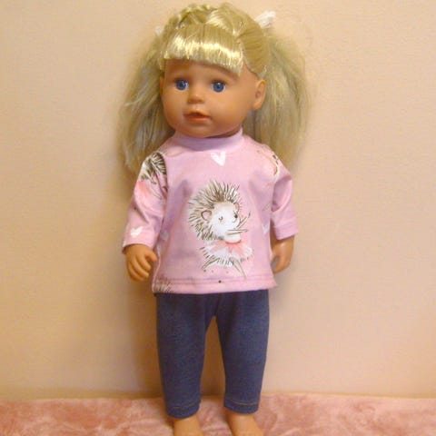 43 cm nukelle (baby born tai sister) raidallinen trikoopaita, jossa edessä silityskalvosta vaaleanpunainen kimalletähti ja takana pukemista helpottava tarrakiinnitys. Housuissa vyötäröllä kuminauha ja sivusaumoissa pinkki teresomiste.