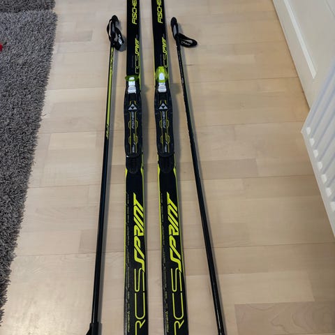 Myydään Fischer RCS Sprint Crown -maastohiihtosukset 160 cm siteillä, sekä sauvat.