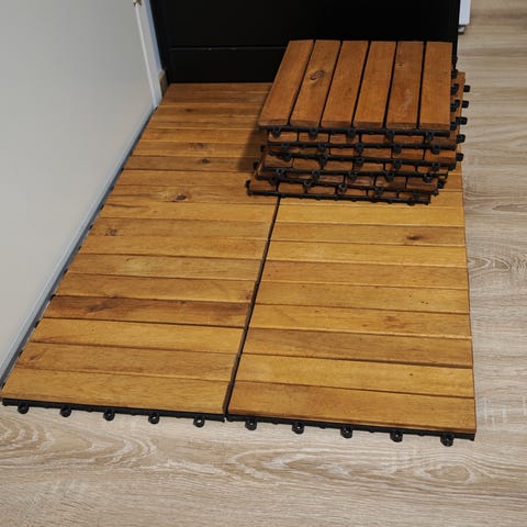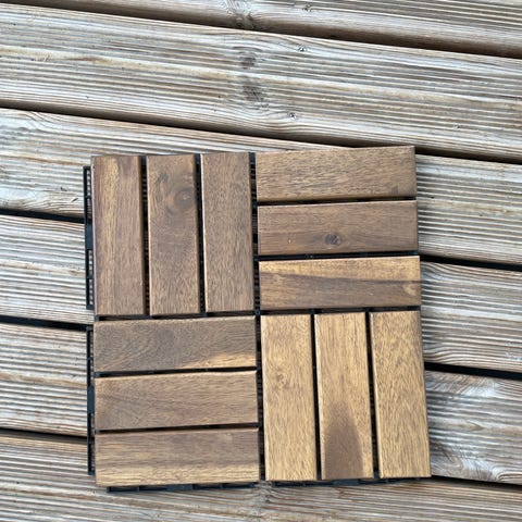Puinen terassilaatta, koko 30x30 cm, väri ruskea. Pakkaus sisältää 15 kappaletta laattoja, (+ halutessa laatat jotka on katkaistu), soveltuvat terassille tai parvekkeelle.
