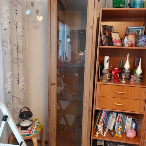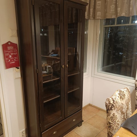 IKEA Hemnes vitriinikaappi, valkoinen väri. Kaapissa on lasiovet yläosassa ja kiinteät ovet alaosassa. Soveltuu esimerkiksi astioiden tai koriste-esineiden säilytykseen.
