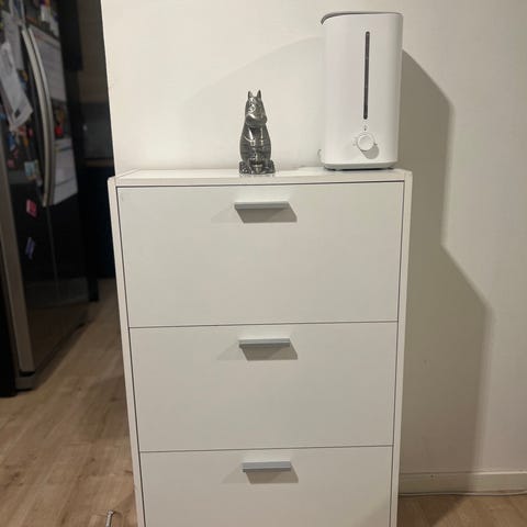Jyskin Kenkäkaappi, jossa kolme vetolaatikkoa, valkoinen väri.