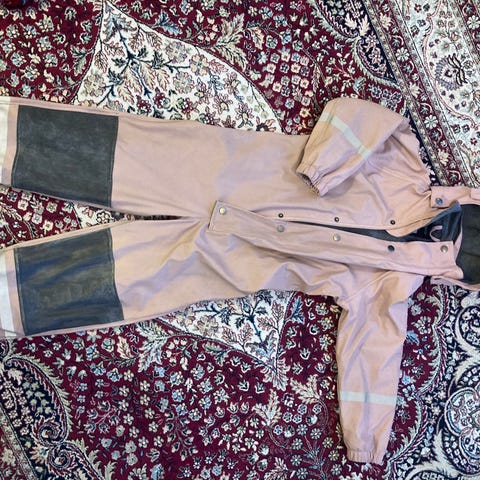 Ripustuslenksua lukuun ottamatta täysin ehjä kurahaalari. Koko- ja materiaalitietoja löytynee merkkiä googlettamalla, koko- tai hintakyselyihin en vastaa. Eläintalous.
