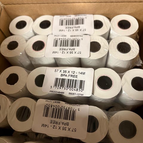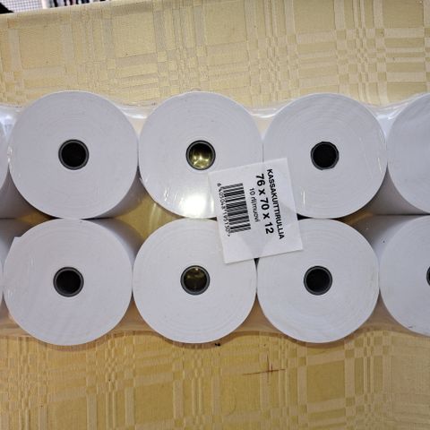 Kassakuittirullia (lämpöherkkä) esim keittiön kirjoittimeen.