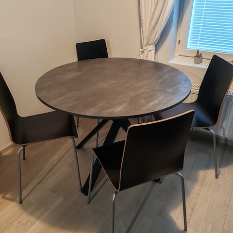 Kaunis musta pöytä. Halkaisija 110 cm. Korkeus 75 cm. Pientä käytönjälkeä löytyy mutta yleisilme oikein siisti. Juhlakäytössä meillä ollut lisäpöytänä.