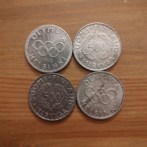 Suomi 500 markan juhlarahat vuodelta 1952, joissa on Olympialaisten teema. Kolikoiden materiaali ja tarkat mitat eivät ole tiedossa.