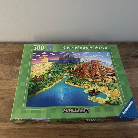 Ravensburger Minecraft palapeli, jossa on 500 palaa. Palapelin kuva-aiheena on Minecraft-pelimaailman maisema, jossa on erilaisia maastoja ja rakennelmia.