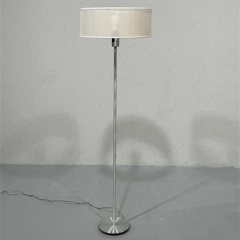 Kromijalkainen, tukeva jalkavalaisin. Katkaisin lampun varressa, korkea koristeellinen varjostin