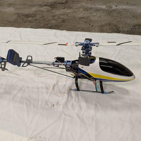 Pikku kopteri lentoon. Pituus n.35cm. Mukaan kaikki laatikoista löytyvät varaosat.