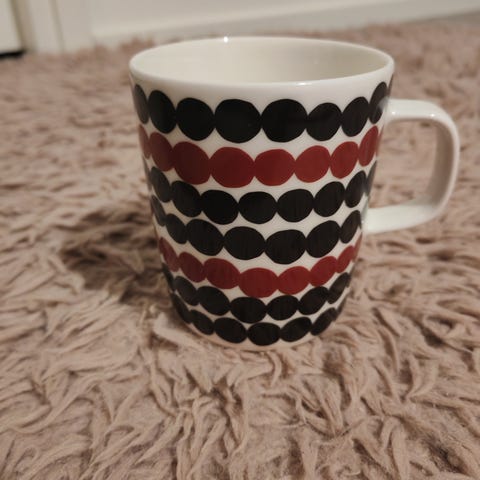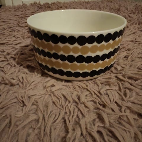 Marimekko Oiva Siirtolapuutarha / Räsymatto kulho 5dl. Punamustavalkoinen väriltään. Vähällä käytöllä ollut. Ehkä kerran pari käytössä ollut ja sitten ollut vain vitriinissä koristeena. Tarkkaan syynätessä pohjalla saattaa tietyssä valossa jokunen pieni lusikan jälki näkyä, jos syynää. Muuten minusta tosi siisti ja hyväkuntoinen. Täysin ehjä.