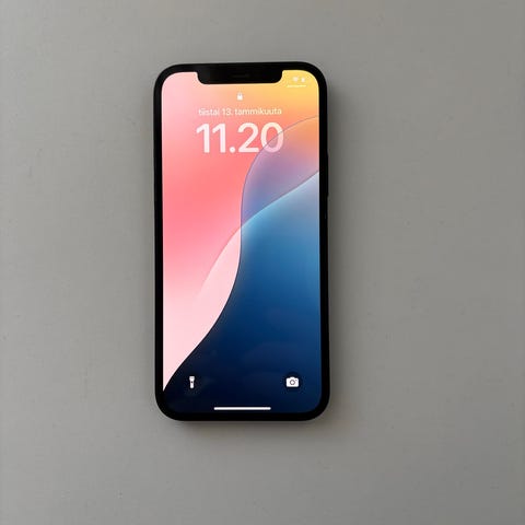 Apple iPhone 12 älypuhelin, 64 GB tallennustilalla, sininen väri. Puhelimessa on pieniä käytön jälkiä reunassa, mutta näyttö ja takakuori ovat ehjät. Sopii päivittäiseen käyttöön. Etu- ja takalasi ehjät. Akkukapasiteetti 76%.