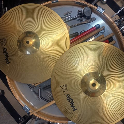 Premier hi-hat. Mallista ei tietoa. Olisiko jonkun Cabria setin mukana tullutta rautaa. Kolhua lommoa, mutta toimiva. Nouto.