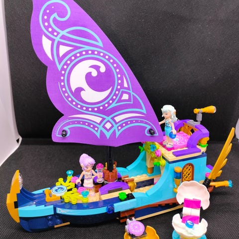LEGO Elves Naidan mahtava seikkailulaiva leikkisetti sisältää värikkään purjelaivan ja kaksi hahmoa. Takakansi rakennettu eri tavalla kuin mallissa ja siinä vaihdettuja paloja.