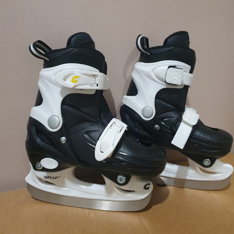 Valko-lilat Graf-merkkiset luistimet, joiden kokoa voi säätää 27-30. Lämmin ja pehmeä jalkaosa. Suojat saa mukaan.