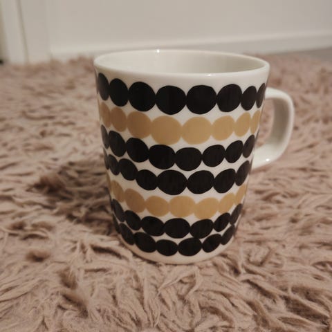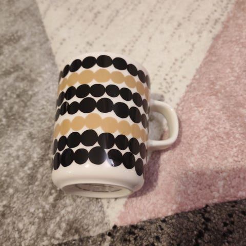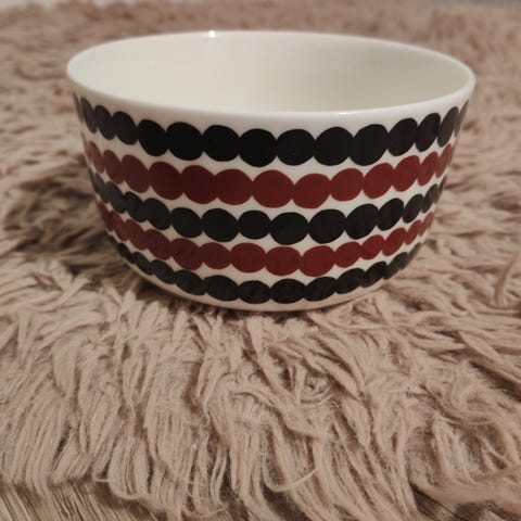 Marimekko Oiva Siirtolapuutarha / Räsymatto kulho 5dl. Kulta/beigemustavalkoinen väriltään. Vähällä käytöllä ollut. Ehkä kerran pari käytössä ollut ja sitten ollut vain vitriinissä koristeena. Tarkkaan syynätessä pohjalla saattaa tietyssä valossa joku pieni lusikan jälki näkyä, jos syynää. Muuten minusta tosi siisti ja hyväkuntoinen. Täysin ehjä.