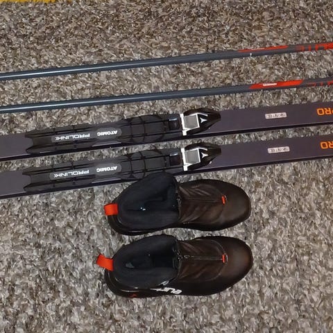 Atomic Redster Classic 188 cm pituiset karvapohja sukset. Mukana Swix sauvat ja salomon monot kokoa 42½. Soveltuu perinteiseen hiihtotyyliin. Monot mustasiniset, sauvojen pituus 140cm kahvat ja hihnat näkyvissä kuvissa.