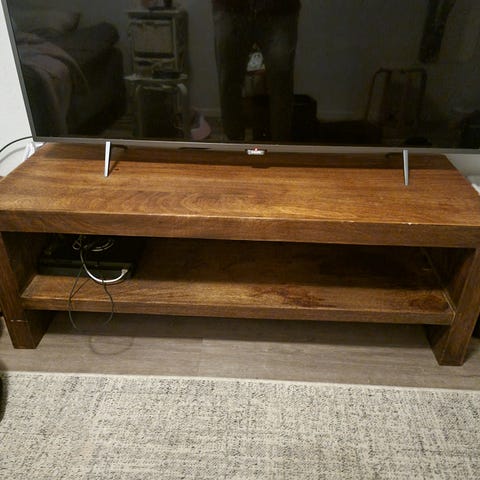 IKEA TV-taso, korkeakiiltoinen valkoinen. Soveltuu esim. television ja muiden mediavälineiden säilytykseen, molemmat hyllyt ovat avoimet.