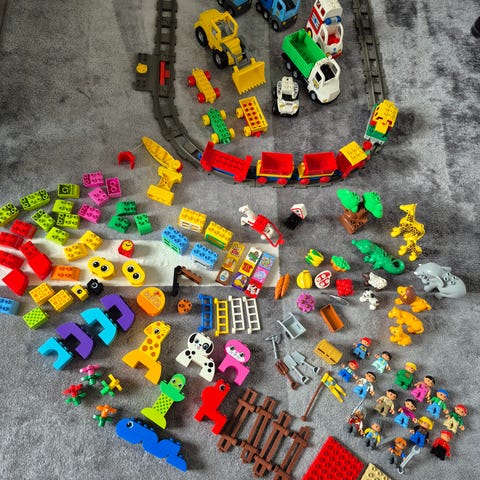 Poika haluaa myydä duplonsa kerralla kaikki seuraavalle leikkijälle. Ja hankkia itselle isomman pojan leluja. Pussissa useita ajoneuvoja. Junarata setti 38 radan osaa ja pattereilla toimiva veturi.