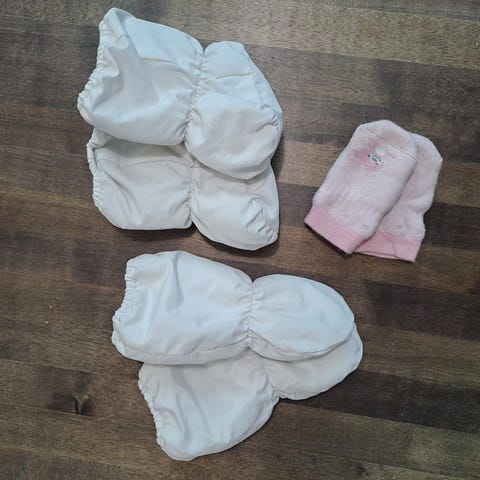 Söpöt pupukuosiset töppöset 0-12 kk ja siniset vuorelliset rukkaset, joissa vetoketju helpottamaan pukemista. Rukkasissa on nimikointi. Hyvä käytetty kunto.