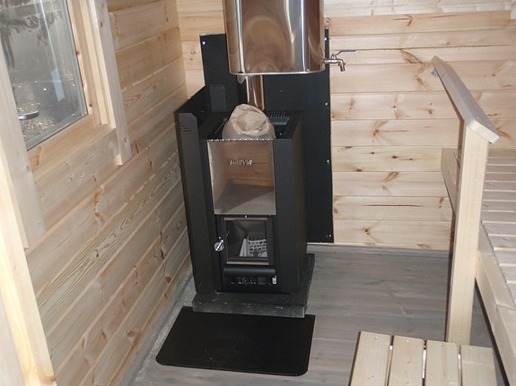 70 mm höylähirrestä valmistettu sauna. Rakennuksen koko 4,80 m x 2,40 m (saunan osuus 2,1 m x 2,40 m) + terassi 4,80 m x 1,5 m. Löylyvalmis.