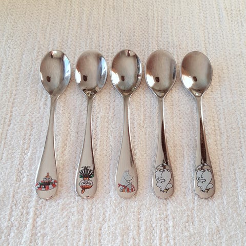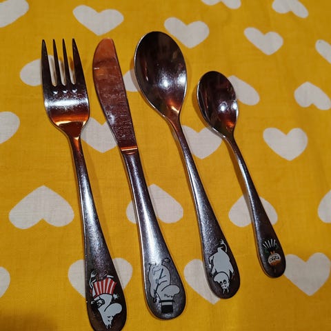 Hackman Muumi lasten ruokailuvälineet, Talvi-sarja sisältää haarukan, ison lusikan ja kahvilusikan. Välineissä on Muumi-aiheiset kuvat. Materiaali ruostumatonta terästä.