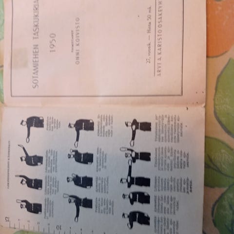 Myydään vuodelta 1951 Sotamiehen taskukirja, suomalainen sotilasopas, joka sisältää hyödyllistä tietoa alokkaille ja sotilaille. Kirjassa käydään kattavasti läpi tuon ajan armeijan tapoja, mm. aseen kokoaminen, kunniamerkit jne. Hyvä lahjaidea vaikka vuonna 1951 syntyneelle! muistivihko muistilehtiö armeijan antiikki retro vihko lehtiö rintama puolustusvoimat alokas alokkaan käsikirja sotamies militaria keräily onni koivisto 50-luku 50-luvun kirjallisuus manual manuaali ohjekirja